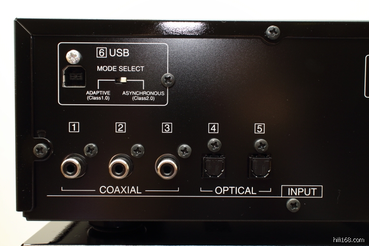 上面说到的6个输入接口在机背图片上一目了然了,分别有三个同轴接口,两个光纤接口,和一个USB接口,USB口右侧还有一个模式开关,分别对应USB2.0的异步模式和USB1.0的自适应模式。一般情况下建议大家使用USB异步模式,声音质量更好。输出方面一共有两组,一组RCA和一组XLR。