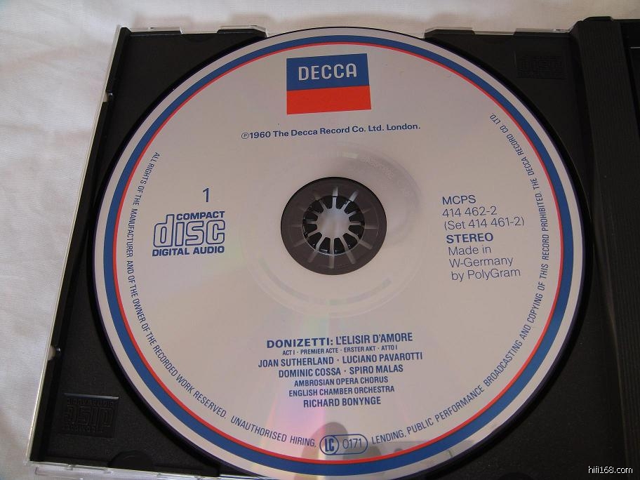 春节在家把玩中意CD,偶然发现06年在金海印李源实体店里买的萨瑟兰、帕瓦罗蒂所唱《爱的甘醇》中,印刷碟面竟然把该碟的首发时间印成1960年,然而那时萨瑟兰刚出名、帕瓦罗蒂还在练嗓呢。封底明确标明首发时间是1971年。搞不明白这1960是什么意思?请李大侠指点迷津,并建议拥有此碟的同好也拿出来看看,是否有相同情况。具体见下图,分别是纸盒封面、塑料盒封面及封底、两张碟子。