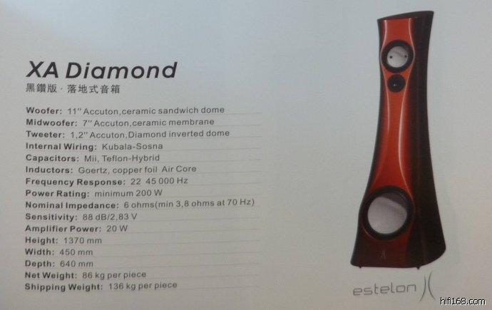 HIEND与HIFI,有一个不同之处在于HIEND器材几乎不计成本去制造顶级的货色。而HIFI,则用有限的成本与物料做尽可能好的喇叭。正因为HIEND的精益求精,花去的人力物力时间都很可观,因此,其索要更多的回报也是理所当然。如同保时捷与大众的区别。这次展会展出的estelonXADiamond高级喇叭,就可以归为HIEND一类。她不仅有着赏心悦目的外表,性感的弧线,内在也是分量十足,本身的重量达到136公斤一个!低音采用ACCUTON11寸陶瓷单元,中音采用