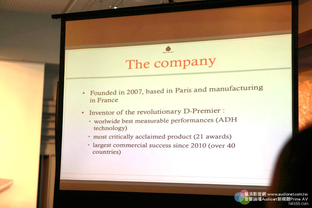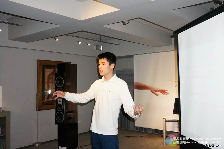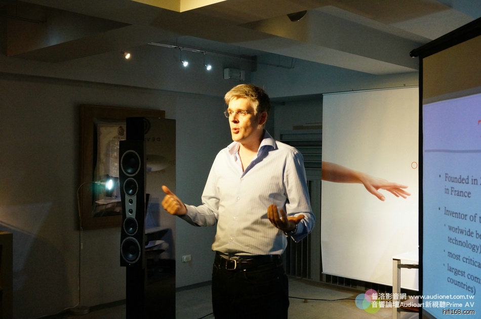 亞洲分公司總經理Andy主要負責講公司的歷史,以及發展,他今年40歲,目前住在新加坡,是英國人。才剛喜獲麟兒,晚上被小寶貝折騰得受不了,說這趟出差真舒服,每晚都睡得很好。哈哈,只要有小孩的都瞭解他的心情。他說英國人跟法國人平常都不對盤,他們同事間也經常以此開玩笑,不過真正相處還是很融洽,畢竟現在大家都有國際觀,尤其Devialet目前最注重的就是亞洲市場,當然要倚重取了韓國妻子、筷子拿得很好的Andy。Andy說他第一次陪老婆回韓國時,由於韓國筷子是金屬的,而且比台灣的還細還短,滑不溜丟,會見岳父岳母那餐他根本夾不起食物,不過現在已經很熟練了,跟老中一樣。