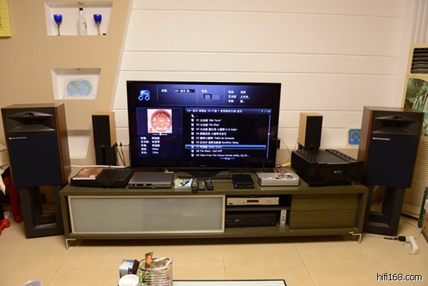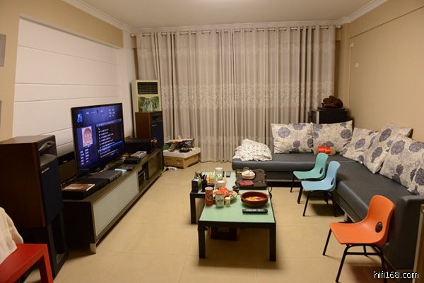 我就放在客厅了,没有专门弄听音室,希望其成为我家庭娱乐的系统,而不是个人爱好的玩具.客厅空间有限制,只能大概摆一下,对定位啥的估计不太有利。吸音方面没有专门弄,因为客厅里面东西已经很多了,角落都有东西,沙发什么都是布的,我看也不利于驻波什么的形成。