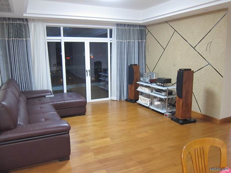 装修的时候没任何声学处理过,装修也是很简单的。音箱后面要挂电视的,还没买。沙发后面也是光墙。有个椅子的地方是餐厅,客厅餐厅连在一起,听音环境不理想啊。