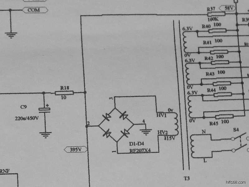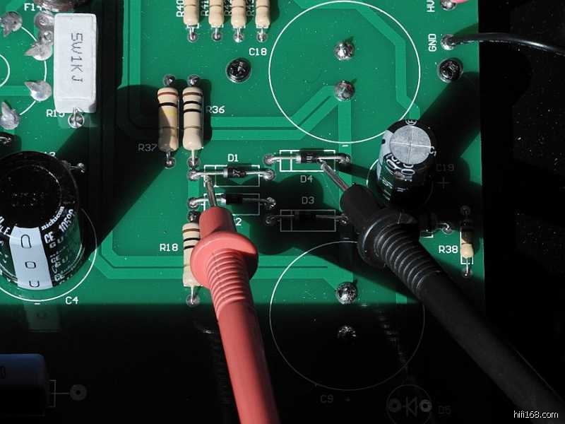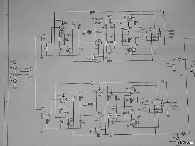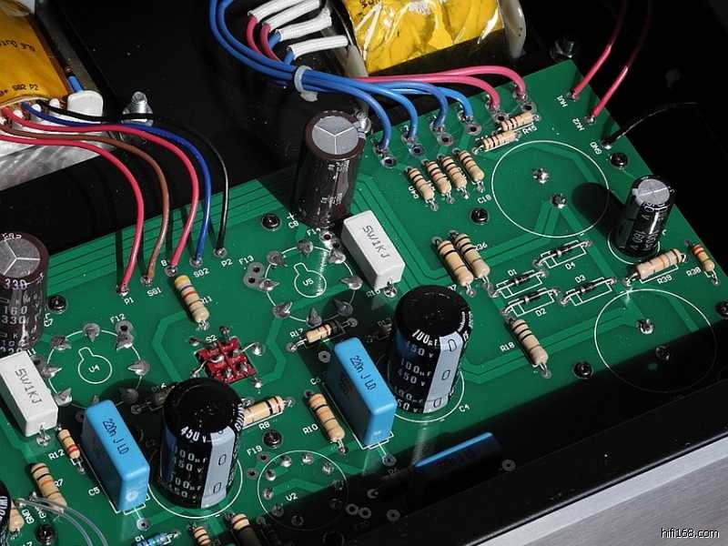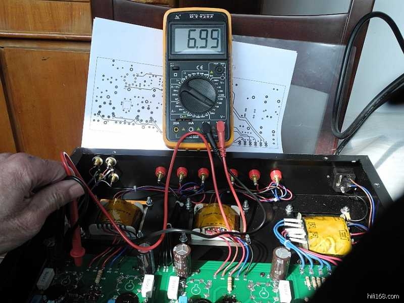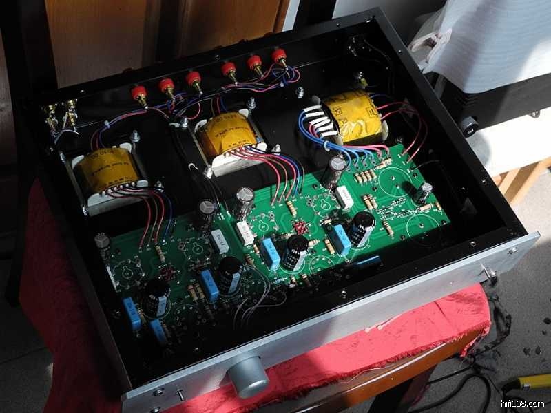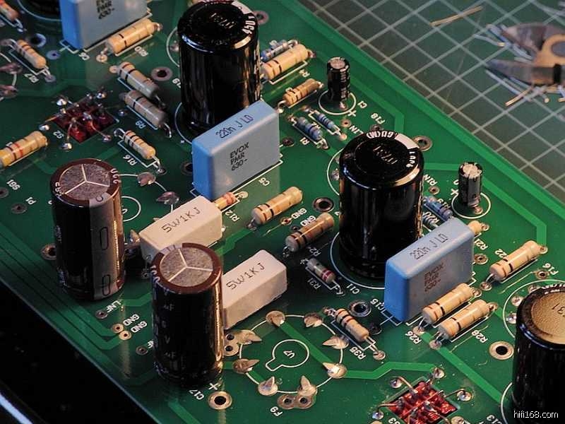 印板上的阻容器件焊接完毕之后,可以参照线路图认真核查一遍以防有误,借此机会亦分析一下整机的电路特点∶整机共采用了七只电子管(12Au7X3、6P3PX4),其中第一级电压放大级两声道共用一只双三极管12AU7,第二级的V2(V3)亦采用了12AU7来作长尾式倒相,具体来说V2(V3)的上端为激励管,下端为倒相管,此电路的特点是V1电压放大管的屏极与V2管上端的栅极直接耦合,从而构成长拖尾形式,因此输出信号具有相移失真小与频响范围宽的特点。V2(V3)管上端为共阴极形式,信号放大之后由屏极输出;V2(V3)下端则为共栅极方式,信号经阴极直耦输入,再由屏极输出,由于倒相级阴极加有较深的电流负反馈,故稳定性较好。
