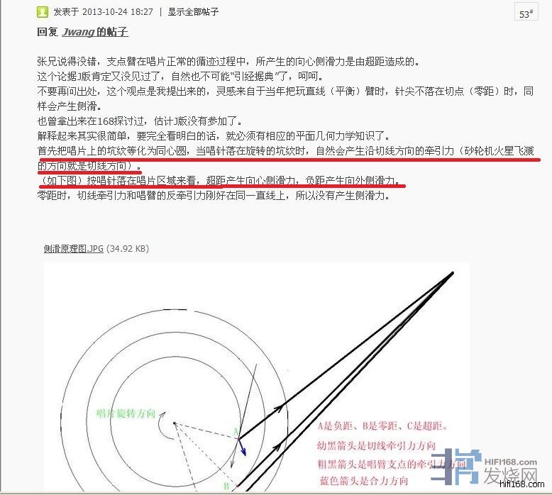 首先,在数学上,切线就是意味着在泰勒斯圆周上。在泰勒斯圆周之外,只有在两个零点上针杆和音槽成切线。也就是说,针和盘中心成直角。超距并不导致侧滑向内(或向心)。导致侧滑向内是因为针杆和音槽没有成为切线关系。这样就产生了一个向内的力。同样,负距下,由于针杆和音槽不成为切线关系,就产生了一个向外的力量。这样,侧滑就向外。所以,超距不导致侧滑向内。