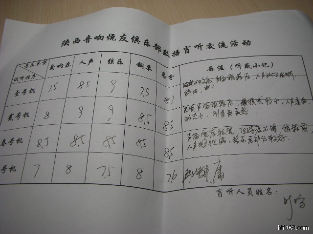 4、所有盲听人员根据个人喜好进行每组单项分的打分,最后四个单项分相加后÷4得出总评分。4台机器的最后总评分由主评委的平均分(50%)+副评委的平均分(50%)算出。盲听表格中的备注部分烧友可根据听感随意写一些文字内容。最后必须亲笔签名(168网名或俱乐部网名)