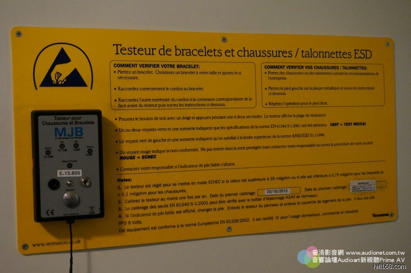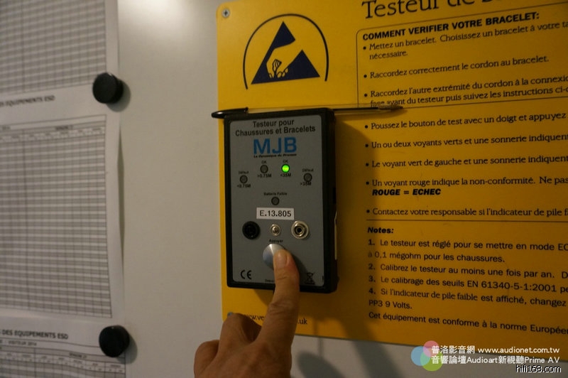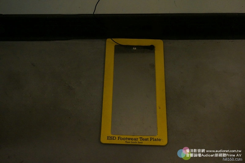 進入工廠很嚴格,要穿上防靜電衣,在於鞋子底部貼一條導引靜電的貼條,貼條要連接皮膚,然後踩在踏板上測量身上的靜電有沒有導入大地。這是測試器。