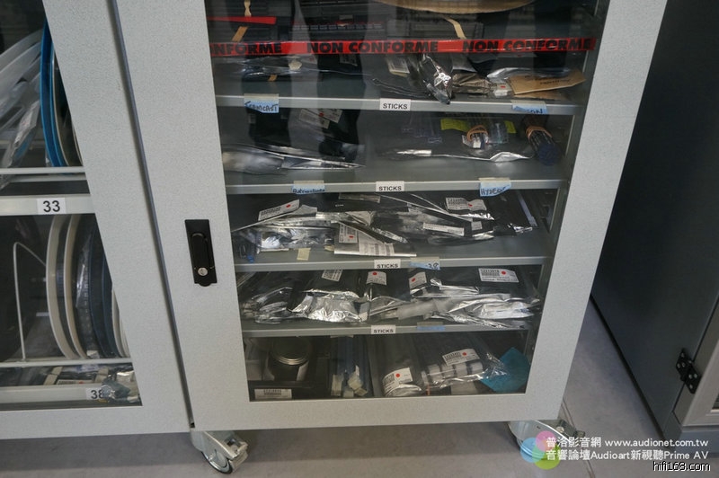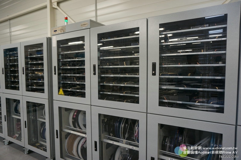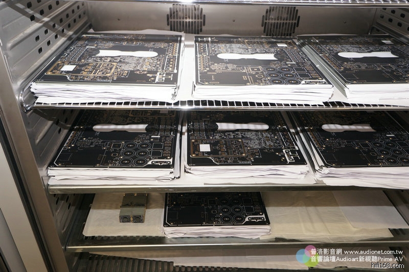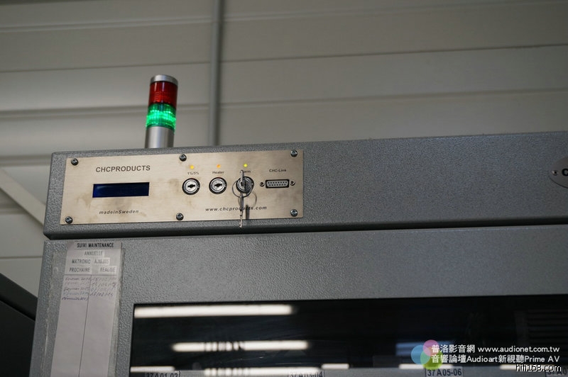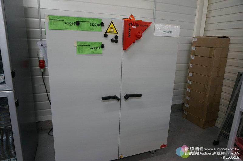 這些櫃子裡裝什麼東西?裝Devialet的印刷電路板與一些精細元件。請注意看櫃子上方有綠色電源燈號,這些櫃子可不是一般鐵櫃,而是恆溫恆濕控制櫃。