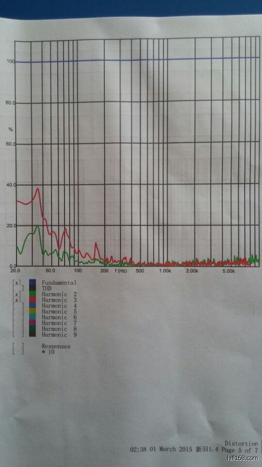 95分贝声压近场量度的失真图,由于测试箱的容积问题,低于一百周是近似值。