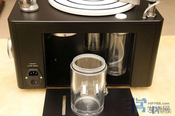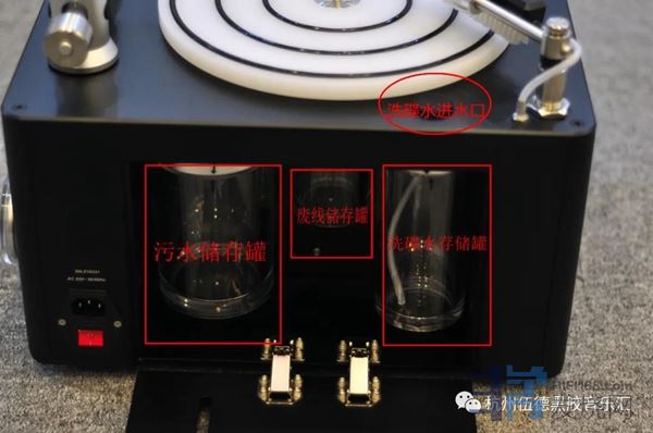 整个洗碟机外观非常精致、紧凑,做工非常不错。04.jpg(35.57 K)2020/9/3 14:58:19这个线洗机的奥秘就在这个特氟龙真空吸头上。用洗碟水洒在唱片上,用扫清洗后,就要吸走唱片上的洗碟水和污垢,一般的一字形真空吸洗碟机由于不能碰到唱片,所以要离唱片一段距离,导致真空吸的力度不好;而且,一字形的由于吸的面积大,导致每个点上的吸力更加分散,再次导致真空吸的效果不好。而线洗机由于有绵线做特氟龙吸头和黑胶唱片之间的缓冲介质,边洗边走线,可以让吸头几乎紧贴唱片来真空吸,距离越近,吸力越大,所以吸的效果好;而且,线洗是一个点在真空吸,吸力够凝聚,所以吸得更彻底、干净,气泵不用太大所以工作噪音也相对更低。05.jpg(23.18 K)2020/9/3 14:58:19这就是传统几千元级别的洗碟机,吸水管的吸水面积大、而且不能紧贴唱片。06.jpg(16.21 K)2020/9/3 14:58:19这是俗称烟斗的吸水管,可以看到吸水工作面积大,所以吸力会被分散。07.jpg(8.41 K)2020/9/3 14:58:19这款线洗机具有普通真空洗碟机的6倍吸污力,此外,线洗机的棉线还有毛细作用,可以帮助把唱片表面的水分和污迹吸收,比单纯真空吸更加直接有效。还有棉线比黑胶音轨粗多了,它不能深入到声轨的,另外,棉线接触唱片的压力很小,不到10g,是目前所有真空洗碟最小的,所以对音轨是完全没有影响的。这里还要特别感谢香港《音响技术》草哥百忙中给我做的线洗机原理科普。08.jpg(25.63 K)2020/9/3 14:58:19RCM-C的操作按键一共有三个,操作都非常简单方便。09.jpg(33.08 K)2020/9/3 14:58:19我们将一张需要清洗的唱片放上线洗机后,按最下面的start clean,机器转盘开始转动。10.jpg(33.64 K)2020/9/3 14:58:19唱片转动后,按最上面的水滴符号按键,下图的清洗刷就会喷出洗碟水,同时按下清洗刷就可以清洗唱片。11.jpg(33.22 K)2020/9/3 14:58:19白色塑料盖的地方就是放洗碟水的。12.jpg(31.79 K)2020/9/3 14:58:19打开白色塑料盖,就可以加洗碟水了。13.jpg(33.06 K)2020/9/3 14:58:19清洗后,再按中间的finish dry按键,就开始用特氟龙真空吸头对唱片吸水清洁了。下图是气泵负压表,可以检测真空吸头的工作情况,-0.5到-0.7是最佳工作状态。14.jpg(27.66 K)2020/9/3 14:58:19调校清洗唱臂的配重锤(红圈)可以调校真空气压,和针压一样道理,不过这个线洗机在出厂前已经调好配重,大家一般不需要再调校。15.jpg(34.16 K)2020/9/3 14:58:19