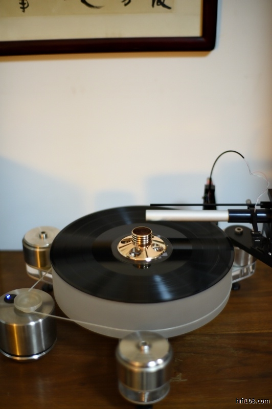而德国清澈唱盘精度高,平整度好,经过几次比较,阿玛尼的这个唱片镇最好也别用,用了会丧失很多中高频的鲜活度和细节,低频会偏闷厚。个人感觉MC唱头输出小,对外界压力敏感,如果唱盘素质上档次,不用唱片镇,让唱头轻松自由的循迹更好。MM唱头加平价唱盘根据情况,可以试试唱片镇提高读取稳定度。一切以实试为准。