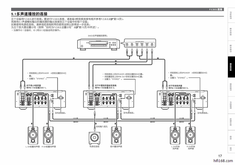 估计你没有看说明书,F.C.B.S最多能连接4台PM-11S3,除2台的 COMPLETE BI-AMP,还可组成高品质的5.1或7.1多声道: