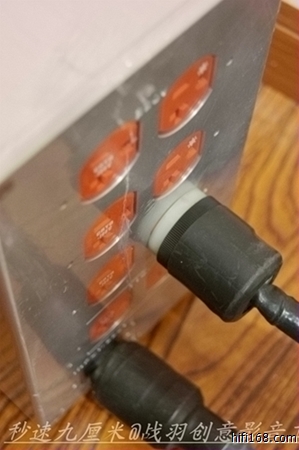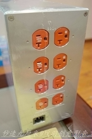 顶端面设有一枚红色开关掣,仅就外表而言极为普通,但却是可以承受电流高达15 A并经过冷冻处理的空气开关,有着优异的导通隔绝性能。箱体后端面对称排布两列共八枚美国进口镀金冷冻美标电源插座,其中上端六枚提供220V电压输出,下端两枚提供110V电压输出,而一枚高档镀金电源输入尾座则位于背面最下方,用于电源的接入。