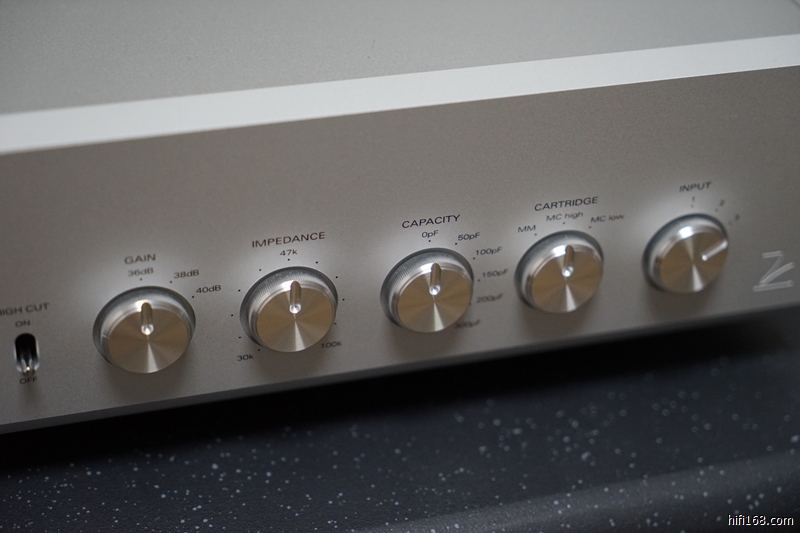 在参数设置上也是同样丰富,MM级增益有三档可选36dB、38dB、40dB,负载阻抗由30K一直到100K无段可调,电容值的设置有0pF、50pF、100pF、150pF、200pF、300pF可选择,MC唱头则有高低两档阻抗可以选择。