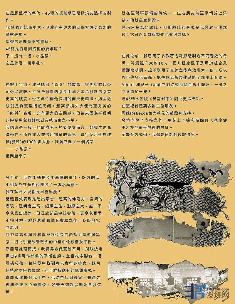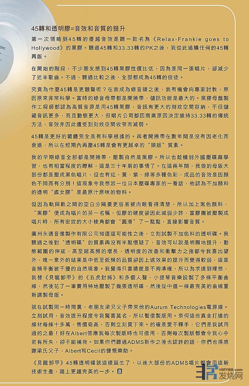 以下是音响技术440期Leo冯老师写有关《见龙卸甲》45转水晶胶大碟的文章供各位参考: