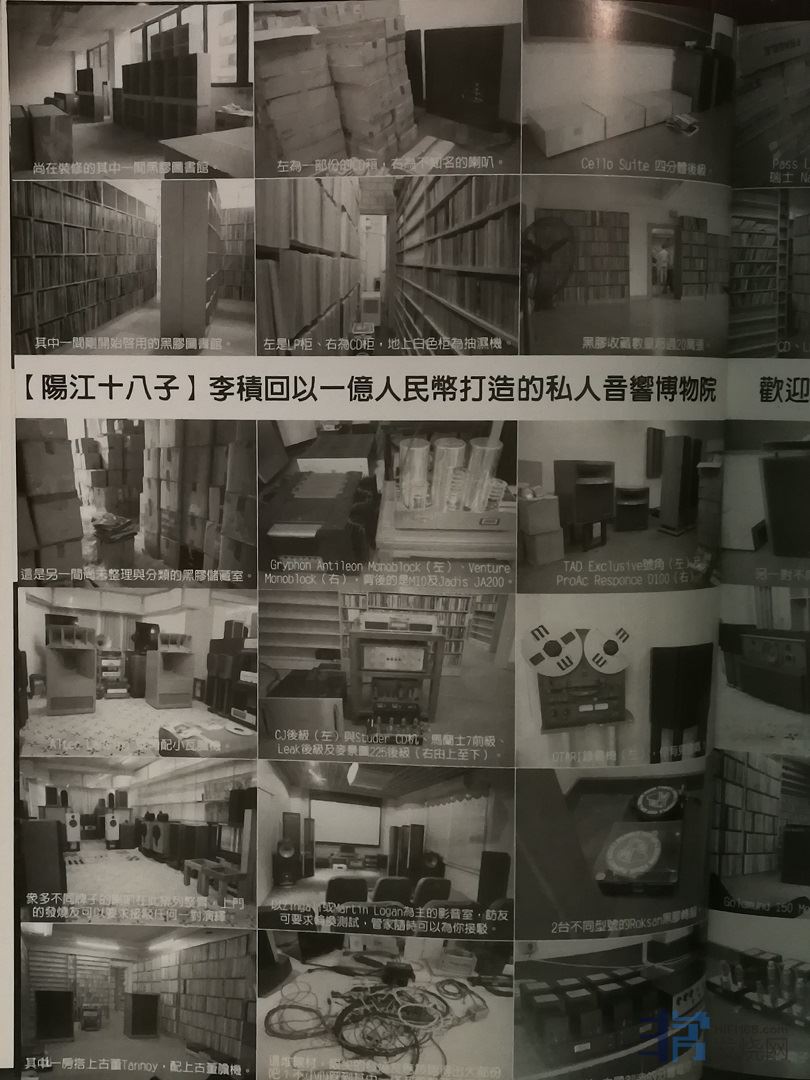 再上去,除了看到意料中的音响房,就是收藏数量一万多张的CD及一万多张的LP储藏室。这里的软件被分类成有发烧碟及录音一般的陈列柜,房内也设置了除湿机。而各个音响房分别有不同的系统:Marantz经典前级,后级有 McIntosh 225、Conrad Johnson、Audio Note 300B Monoblock、Goldmund 150 Monoblock,陪衬的喇叭多是冰箱 型的古董ExclusiveTAD与Tannoy。这些系统并不只是随便摆着展示而已,它们全都是在操作的,而这里的每一间 音响房的墙壁皆做成CD、LP陈列柜,要测试或聆听软件伸手可取,方便之极。拉开其中一个软件陈列柜,里面居然 还有一个隐藏式的储藏室,小小的储藏室也有一个陈列柜,上面摆放了十余对不同牌子的书座型喇叭:Venture、 Genelec、ProAc、KEF LS3/5A及全世界只有200对的限量版Rogers LS3/5A。