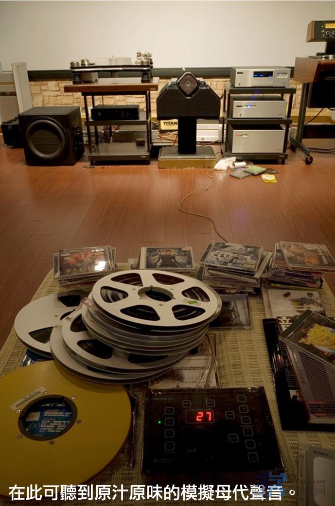 正式进入参观,迎入眼帘的是一整排的喇叭,从书座型至座地型的KEF、B&W、甚至是大型号角的Altec,连一向来 只能在网上看到的JBL4350也在此,身躯大的有如冰箱。其它还有古董天朗(Tannoy)、Exclusive TAD、JBL、 Westlake等。古董号角喇叭旁也摆着几台讯源及胆功放,意味这些器材并不是闲着,它们其实都是处于演绎状态。 除了这些,地上堆积了数十盒的原状录音母带、三枪投影机。展示柜内的单枪投影机、讯号线、电源线、喇叭线。 还有两间房,虽然隔着玻璃,还是可以清楚看到存放在里面的前级与功放:Goldmund、马兰士7+9、Krell、Bel Canto、Bryston、Cello、Nagra、Darzet、Gryphon、Luxman等等。还有喇叭