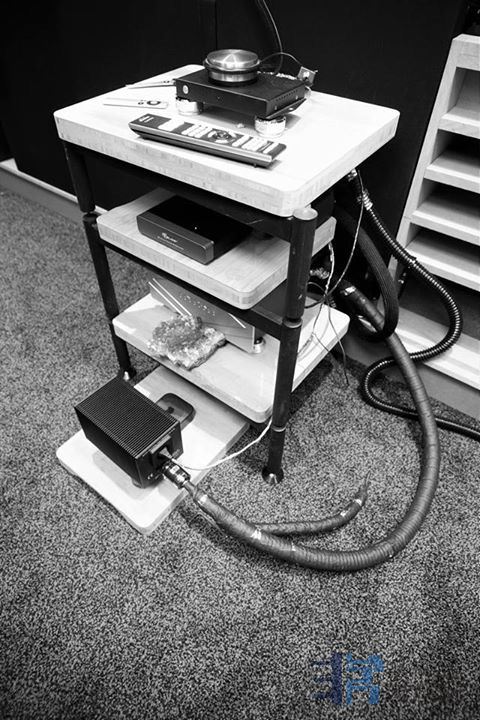 来看看这个设备架,虽然不认识这个架子,也能看出非常贵的制品,好像是传说中的“架宗”。还特别在功放上压了稳定的HIFI道具!具体什么牌子没研究。