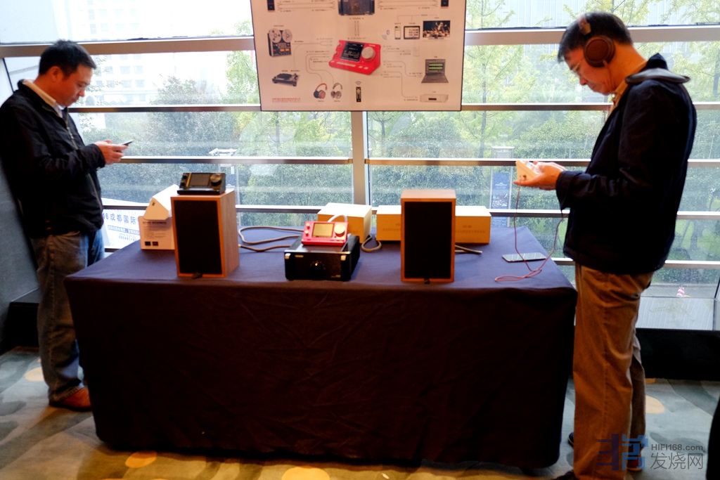 德生的展房,老板涛涛不绝的在向大家介绍他的一体机,耳机、音箱(又一仿3/5A)、功放(60W吧)。