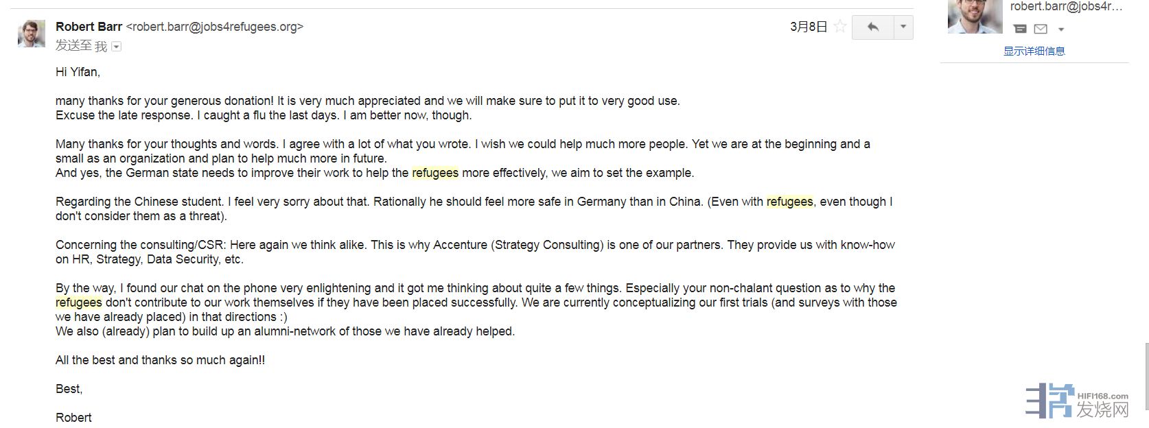 在这里上传一下捐款的凭证。以及我与这位组织者的对话。主要就是谈了一下他们活动的现状以及我个人的一些期望。我虽然对那些骂难民,甚至骂帮助难民人们的人极其鄙视,但是不得不承认那些“正能量"媒体们一边喊着真善美,却对难民接纳后融入社会的问题现在搞的是一团糟的事实闭目不见。真正能赢得更多人认同的,不是空喊口号,而是脚踏实地把这件事情做好,向人们证明难民给社会带来的多样性是的确有好处的。为此,我告诉他们不仅要做好事,而且要做的更快。