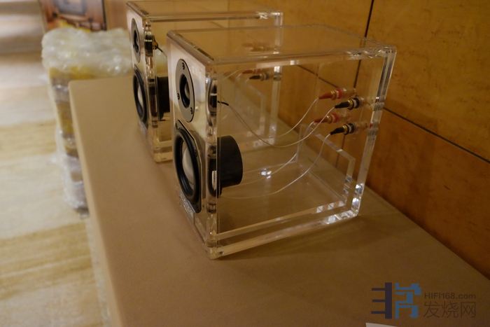 旁边摆了一对很漂亮的水晶音箱,第一眼看起感觉不错。不过凑近了一些仔细瞄了一眼,我不仅失笑了。低频直通,高频分频靠一只电容。这玩意,就图个响罢了。