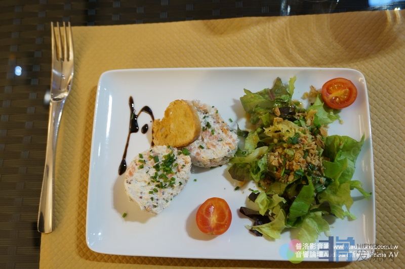 是餐前開胃小菜,此時不要忘了吃麵包,如果您不吃麵包,肯定是吃不飽的。今晚是標準的三道式:前菜、主菜、甜點。前菜是干貝片得薄薄的,加上黑檸檬與湯汁,份量不大,除了開胃,就是要讓您把麵包沾著一點點的湯汁吃下肚。份量雖小,不過的確美味。