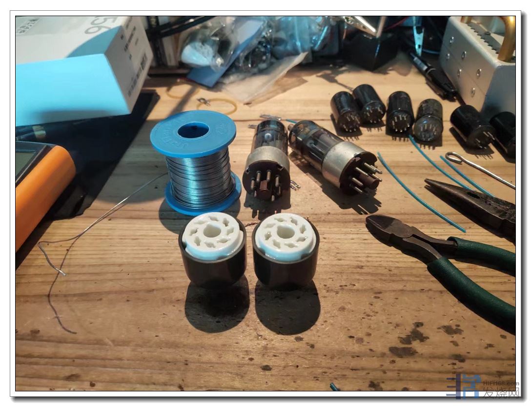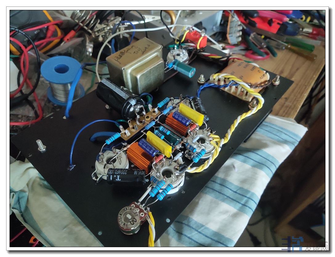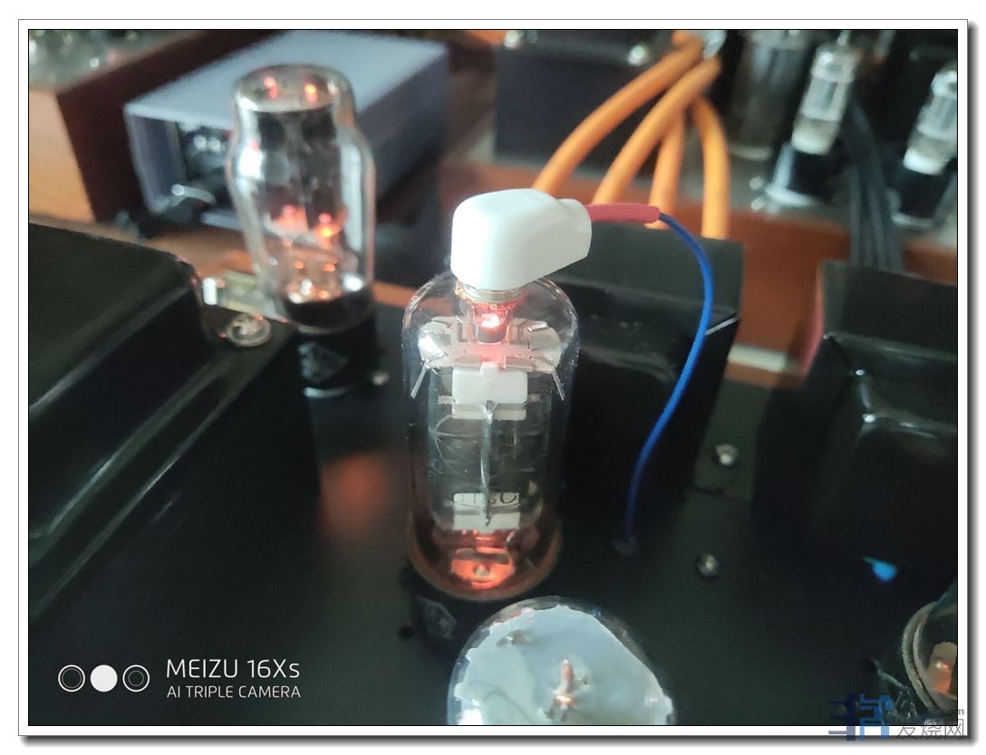 第二是将两只后级阴极电阻间距扩宽了1厘米左右,从而装上了两只性能优异、尺寸也较大的前级退耦电容。效果是底噪纹波直接降至1毫伏,耳朵要贴近喇叭上才听得到轻微底噪。