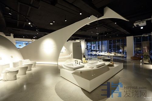 Kohler展示中心内的装潢富有现代感,以白色墙面与透明落地窗为基调,伴随着大型曲线墙面隔间,以钢索悬吊产品平台,在大空间中给人有如美术馆一样的感受,让每件产品都如展示艺术品一样对待。
