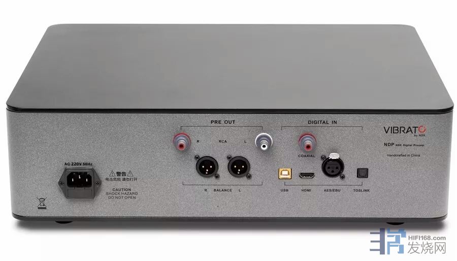 Vibrato首款一体机Model One的成功大大鼓舞了团队,遂沿袭Model One的设计理念推出更多高性价比的产品。NDP数字解码前级放大器外形上依然继承厂家在Model One数字解码合并式放大器上面的风格:全铝合金材料打造的铁灰色机身、弧形的边角、磨砂质感的面板、位于底板上的电源开关按键、较小的显示屏配合较小型的旋钮,显示出精致、有力同时又偏柔美偏古典的审美情趣。按个头来说,NDP属于传统音响的尺寸,作为桌面系统的话可能较大了一些,但它当然也有着匹配其体积的高性能。