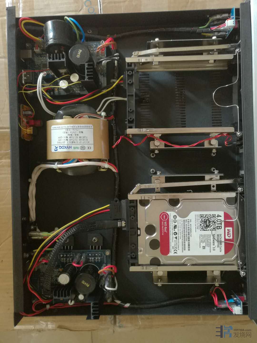 四.现在最大的败笔就是硬盘电源线。一定要定制7N铜镀银屏蔽电源线。12V和5V一定要隔离屏蔽。插头绕3M防辐射贴。