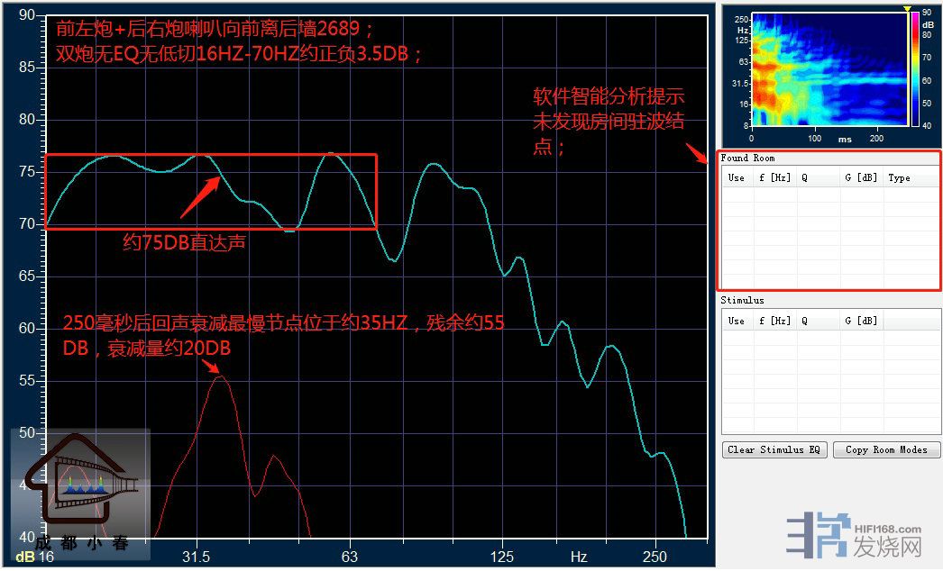 前左炮+后右炮喇叭向前离后墙2689MM,双炮无EQ无低切16HZ-70HZ约正负3.5DB; 250毫秒后回声衰减最慢节点位于约35HZ,残余约55DB,衰减量约20DB;软件 智能分析提示未发现房间驻波结点;