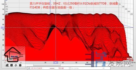 真力声学仪复核,35HZ,经过250毫秒从91DB衰减到77DB,衰减量约为14DB,两套仪器互验数据一致;