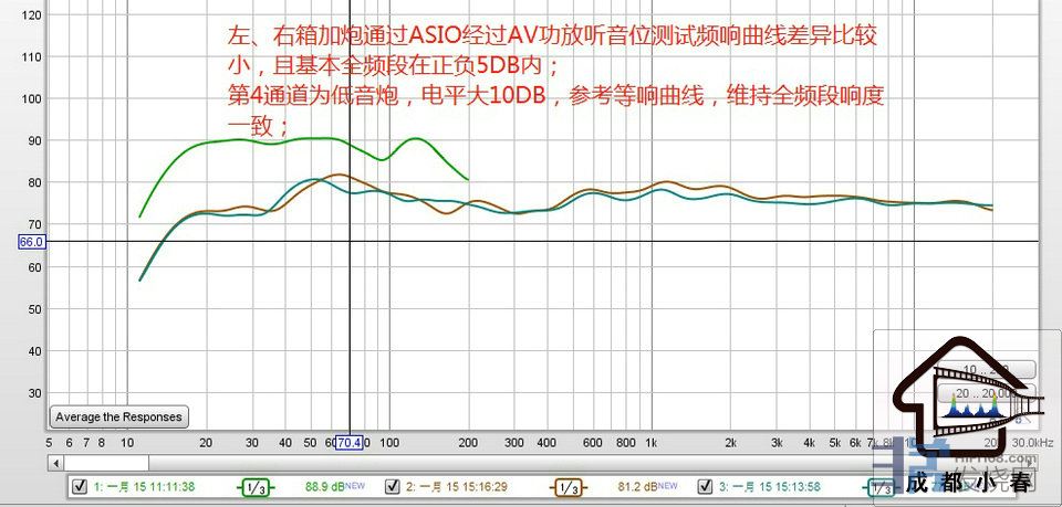 左、右箱加炮通过ASIO经过AV功放听音位测试频响曲线差异比较小(空间声学对称性好,定位结像中正精准),且基本全频段在正负5DB内;第4通道为低音炮,电平比各声道大10DB,参考等响曲线,维持全频段响度有比较好的一致性;