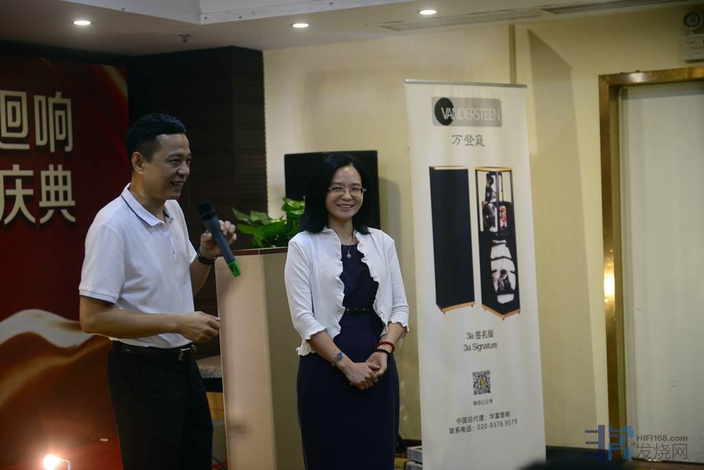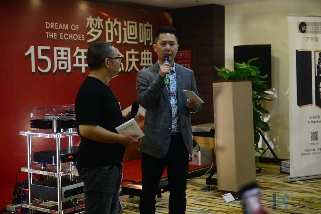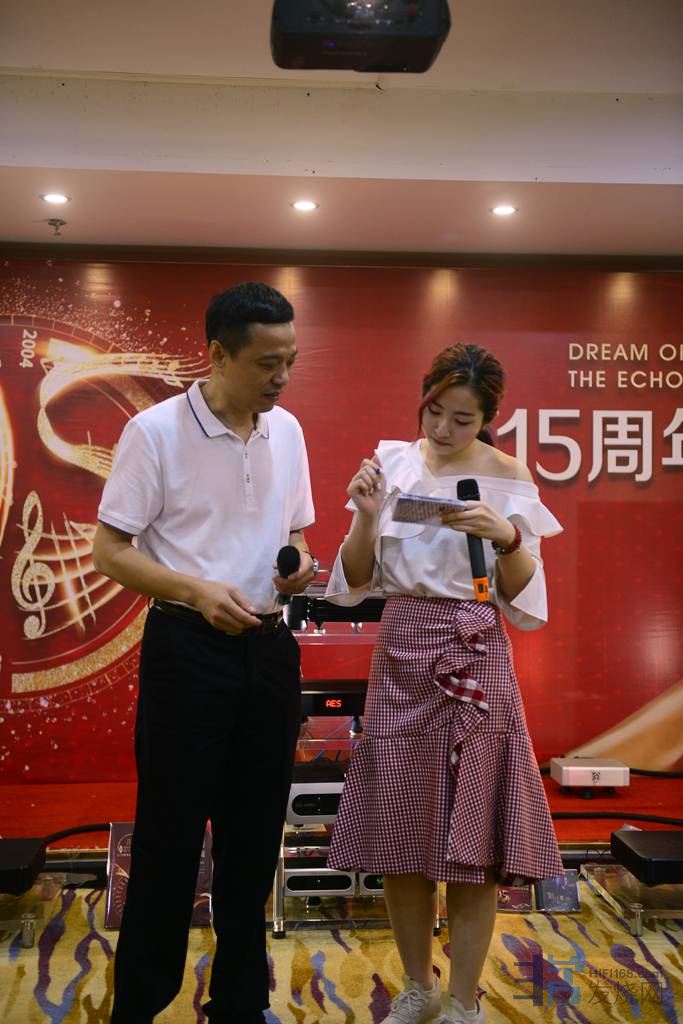 清唱了三首歌曲,马上由华富音响器材组合播放一下这三首歌,给大家听CD录音和现场听听有何不同的感受。之后器材播放也不差。叶会长有请华富音响总经理上来介绍一下她的器材组合和牌子,华富经理是个女的,对音器真是精通,给大家列样配置,相当不错。