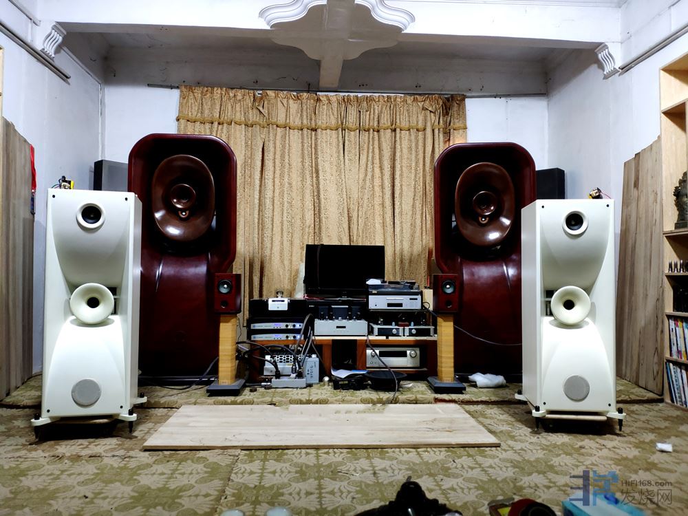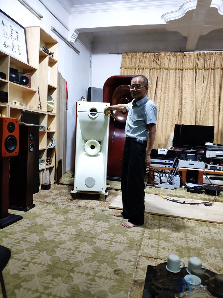 后面李老也给我听了后面那一对小号角,它用了一只号角高音,加两只4寸中频,再加一只14寸的低频,采用迷宫式的设计。就声音和那对大号角有些类似,同样是比较舒适的听感,不讲究hifi性,高频完全没有压迫感,中频富有魅力,低频属于宽松但偏慢和糊一些的那种。用来听人声啥的很舒服,但对强调hifi性的器乐,则稍嫌不足。