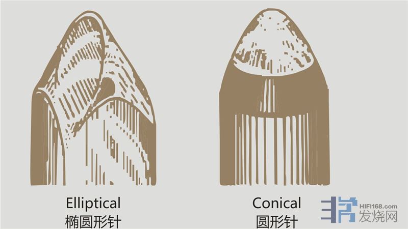 针尖的形状大体分为圆锥形(Conical)与Elliptical。圆锥形针尖已经很少使用,因为它的圆径大约0.003公分,这么大的圆径无法与极高频的沟纹相吻合,许多高频率都无法完整再生。而椭圆针尖则是改良自圆锥形针尖,它的左右二端较扁,可以有效的同时接触到左右沟 槽的每个沟纹。然而,椭圆针尖是最理想的针尖吗?未必!因为刻片头的针尖是三角形的,椭圆形与三角形用想也知道其间的差距。然而,以黑胶制成的唱片能够经得起三角针尖的「刻唱」吗?当然经不起,那么尖锐的三角针尖是用来「刻」片而不是用来「唱」片的。为了求得更佳的循轨与更好的高频响应,介于三角针尖与椭圆针尖的产品产生了,它们有许多名字,例如超椭圆、线性接触、Micro-Ridge、柴田(Shibata Goldringvan den Hul等等。不论它们是什么名称,总之这类的针尖如果用显微镜看,就会发现它们的形状越来越像刺刀。这么锋利的形状虽然可以带来更精确的沟槽接触与更好的循轨能力,但同时也会带来更大的磨损(针尖本身与沟槽)。