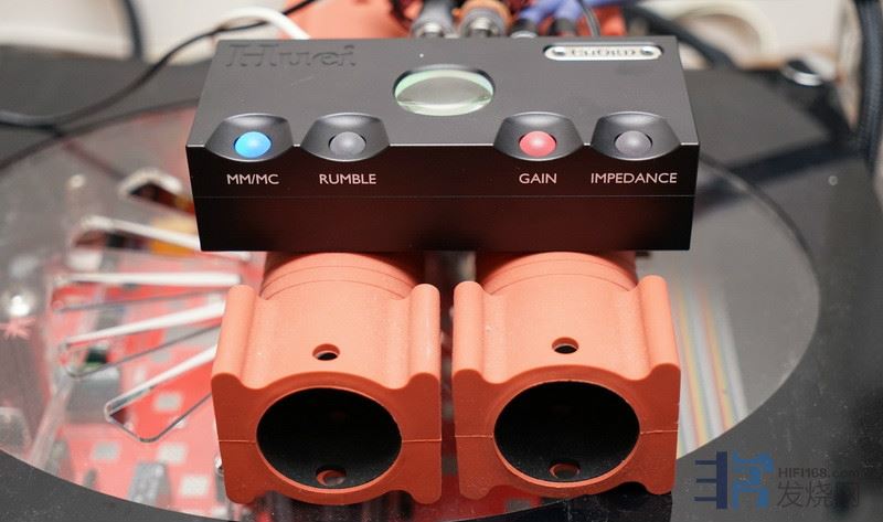 到底要怎么调阻抗值?不必拆机器,也不必转旋钮,就是一直按那个Impedance键,总共有12档,以不同的灯号颜色显示,从100欧姆到3700欧姆,包括100欧姆、100+2.2uF,150欧姆、150+2.2uF、320欧姆、320+2.2uF、470欧姆、470+2.2uF、1000欧姆、1000+2.2uF、3700欧姆、3700+2.2uF。为何会有+2.2uF档呢?这是为了制住低阻抗唱头可能产生的铃振而设,用家可以