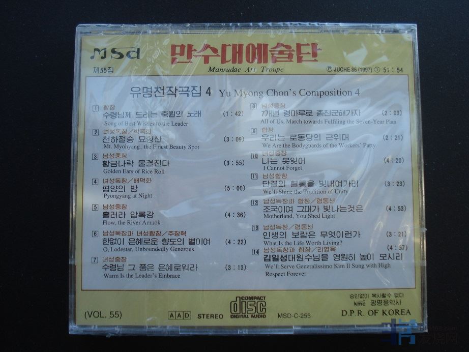 音乐收藏资料    朝鲜立体声高保真CD唱片,朝鲜国家光明音乐社出版的《万寿台艺术团第55集,人民艺术家柳明全作品第4集》朝鲜从1989年开始试产CD唱片,1991年开始小批量出版发行立体声高保真CD唱片。此原版未开封立体声高保真CD唱片产于1997年(主体86年),朝鲜国家用于对外宣传,现已绝版。