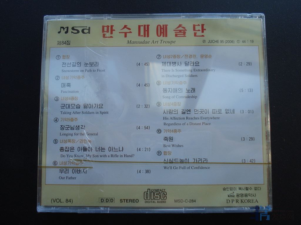 音乐收藏资料    朝鲜立体声高保真CD唱片,朝鲜国家光明音乐社出版的《万寿台艺术团第84集》朝鲜从1989年开始试产CD唱片,1991年开始小批量出版发行立体声高保真CD唱片。此原版未开封立体声高保真CD唱片产于2006年(主体95年),朝鲜国家用于对外宣传,现已绝版。