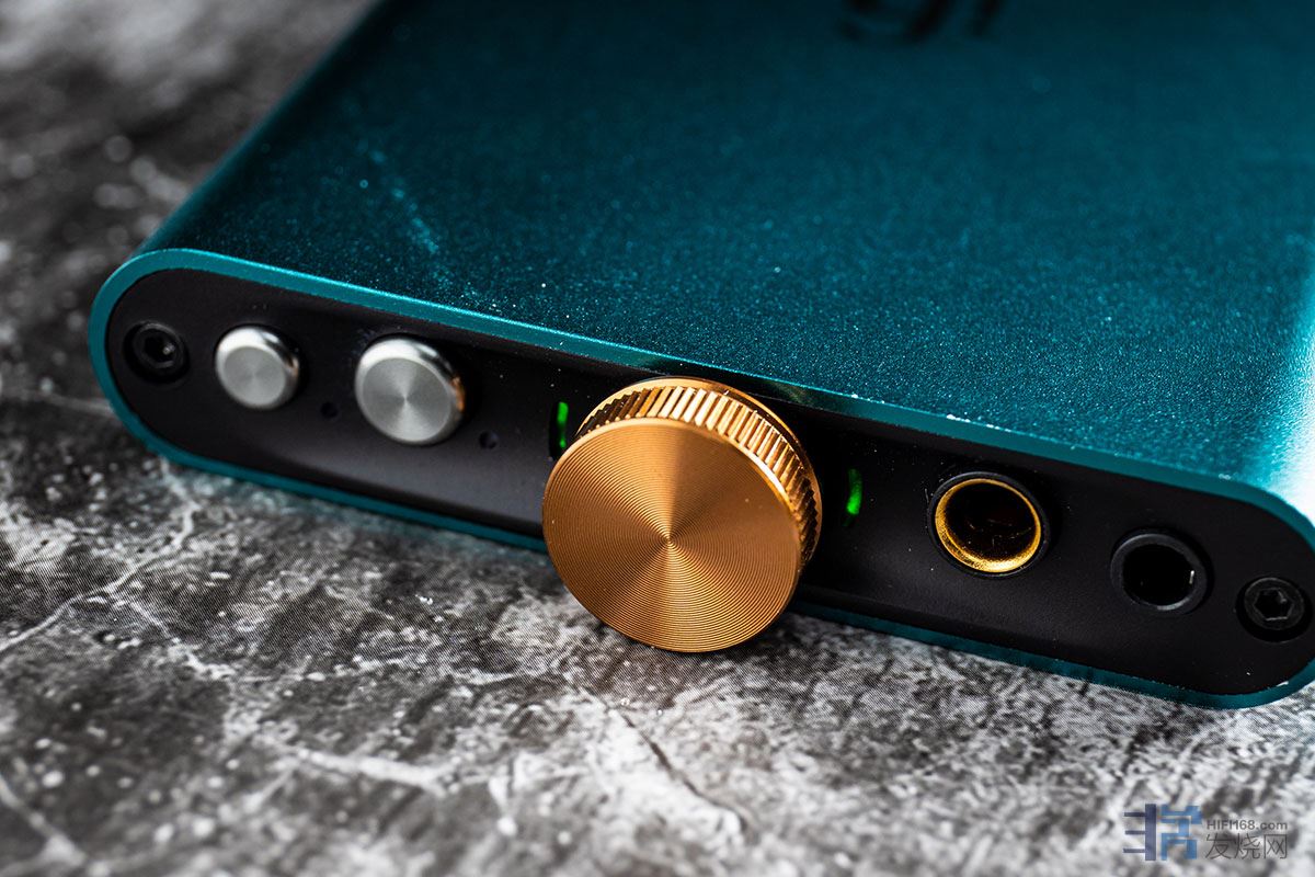hip-dac的一端是耳机EQ和XBass按钮,中间是一个模拟音量旋钮,旋钮的另一边是4.4mm平衡和3.5mm单端耳机输出口。