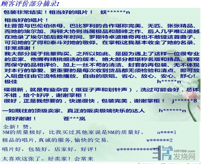 今次借论坛这方乐土向乐友们介绍一下我的小店:《荷塘乐色古典音乐黑胶唱片专营店》(shop72315606.taobao.com)创立于2012年,迄今为止已经为全国的乐友们献上了上万张古典音乐黑胶唱片。店主小张是古典乐迷一枚,旅居德国十几年间将几乎所有的业余时间都用于淘碟。店面上的所有唱片均是店主一张一张亲手从德国、奥地利、法国、美国等地的黑胶唱片店以及私藏家手中收集而来,从而对唱片的品相有了第一手的把控!作为爱乐者,每一张唱片都是自己的宝贝。发货前,二手唱片大都用德国洗碟机进行了专业清洗,换上品质优良的德国原装黑胶唱片内封套,所有单张唱片还附赠一个德国原装黑胶唱片塑料外封套。