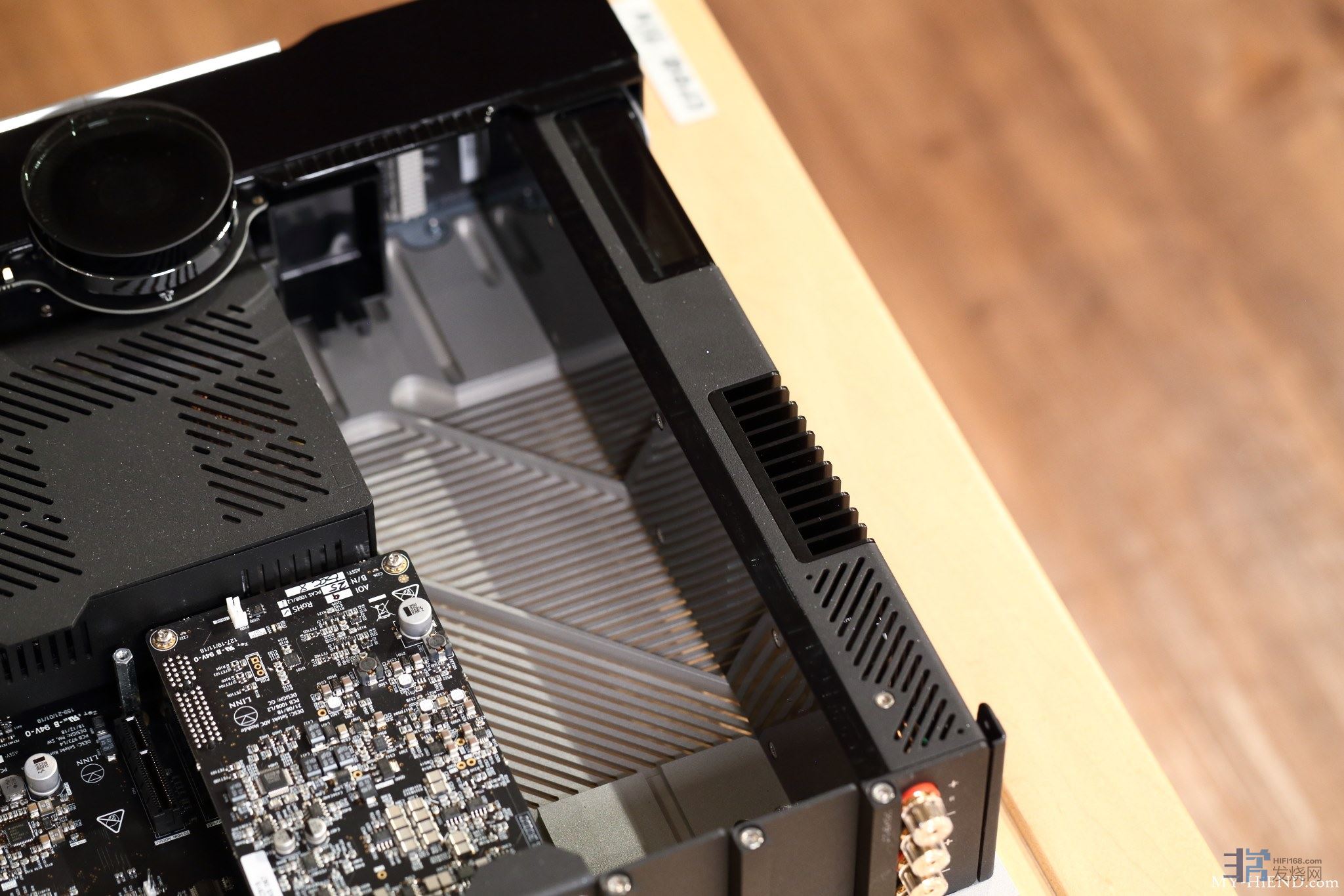 靠近前面板的独立黑盒子应是主电源部,从散热孔隙中看得到内部电容与线圈。