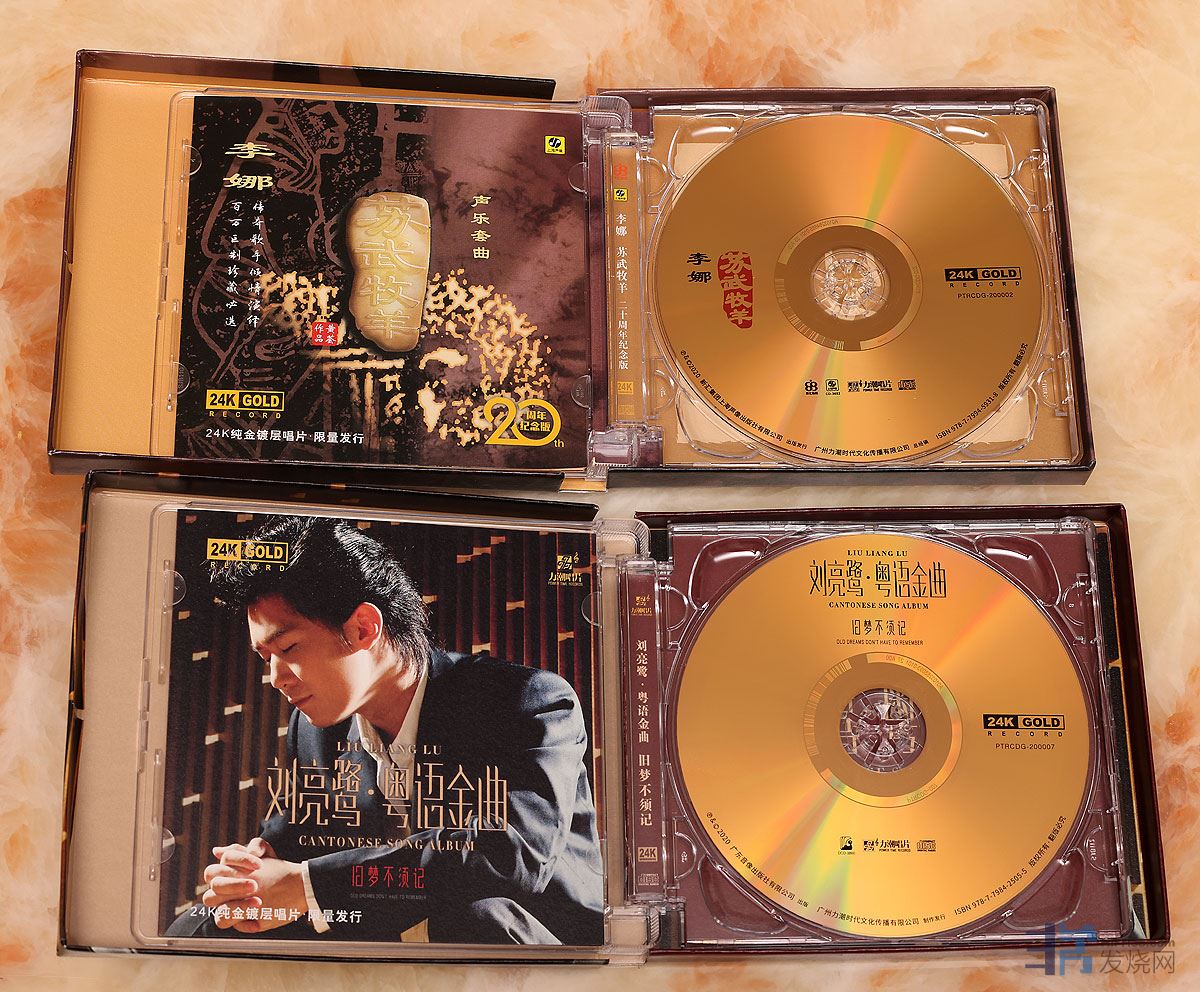 最近力潮唱片用上海新索24K高清纯金唱片格式再版了两张经典唱片:《李娜 苏武牧羊》、《 刘亮鹭 旧梦不须记 粤语金曲》,各限量发行1000张。