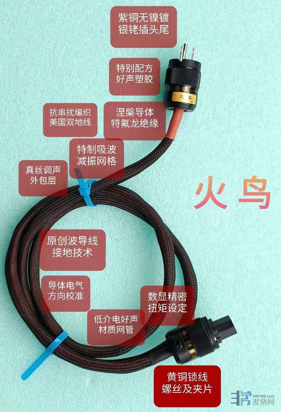 《火鸟》(待发售,敬请期待),听名字就知道,这是一条和经典的《火凤凰》有渊源的线材!这条线是镁声线系列最新推出的产品,是直接把《火凤凰》的关键技术和材料下放到中坚系列、回馈新老客户的超值精品!风格就是鲜活水润,模拟味足,同时具备高解析、层次丰富的特点。《火鸟》最适合用于前端器材,例如转盘、解码、前级、数播等环节。