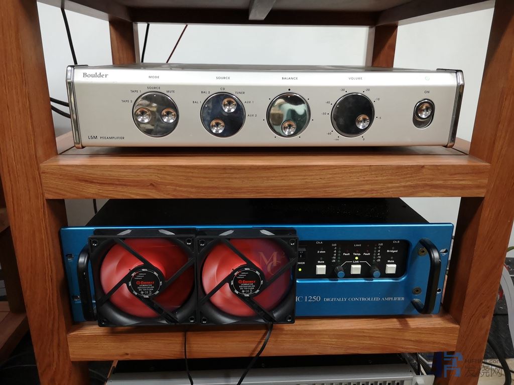 两只喇叭放在脚架上的位置不对称,你也得试一下前后距离,判断哪个位置听感更好。MC2后级没有脚垫,垫材在底板的不同位置也要试。由于这两个木制器材架没有脚钉卸振,所以还要灵活应用器材架的结构寻找听感较佳的谐振区域放置器材。