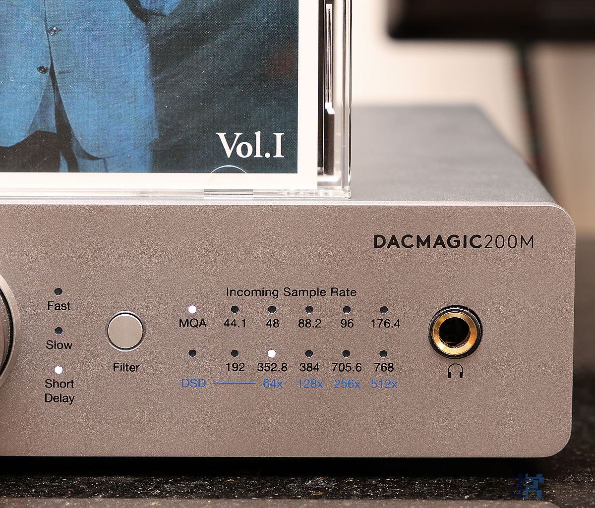 下图就是连上普通CD机后,播放MQA格式的唱片,200M的MQA指示灯亮起,并点亮176.4的指示灯。