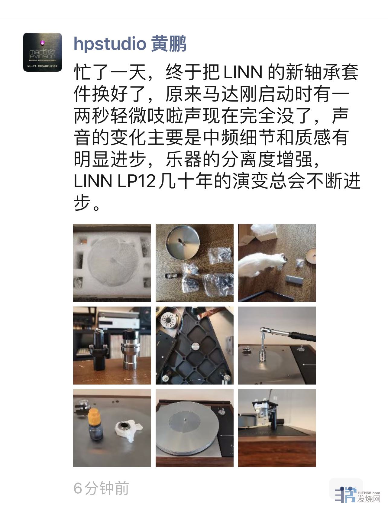 黄鹏老师刚刚给他的LP12升级了最新的轴承套件,这是他的微信朋友圈,我的LP12是最新款,自带这个最新轴承,稍后详细介绍。