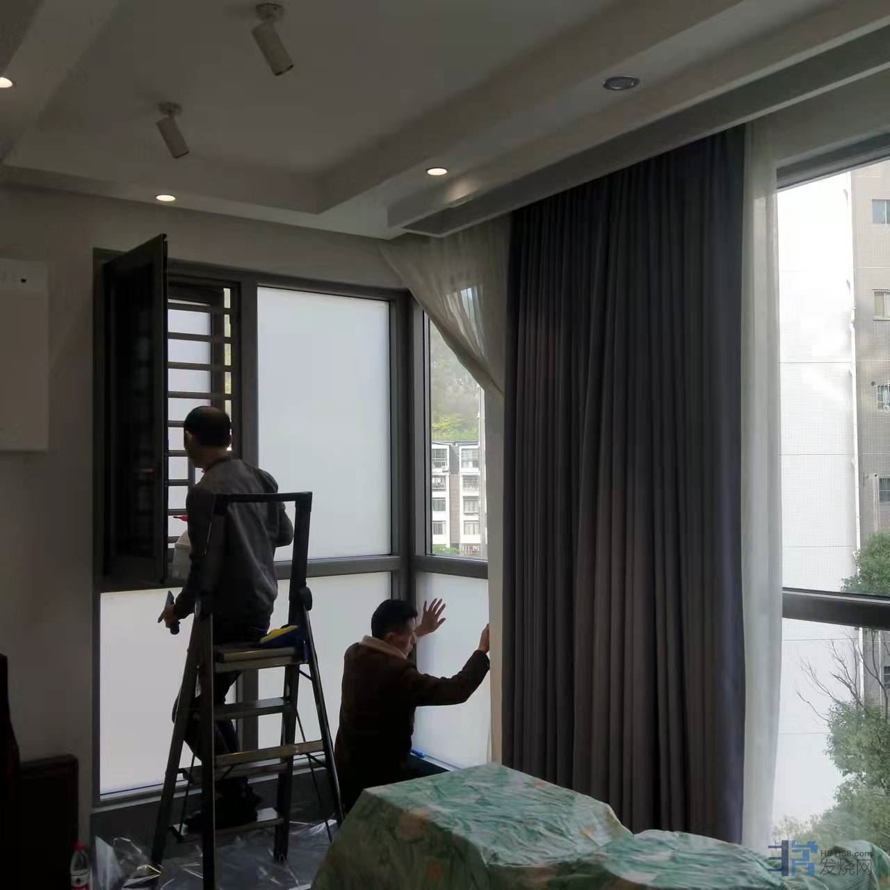 第一步:客厅落地窗包括窗扇全部贴上保护膜,3M白磨砂膜,这一款膜没遮光功能,没挡紫外线功能,没保温隔热的功能,这一切的功能都没有,我只有一个要求:遮挡视线,双向遮挡隐 私!同时耐久。客厅里面无论怎样折腾,闹得天翻地覆都不让人在看见,眼不见为干净!我也不希望有碍于观瞻,影响整栋楼的建筑形象。