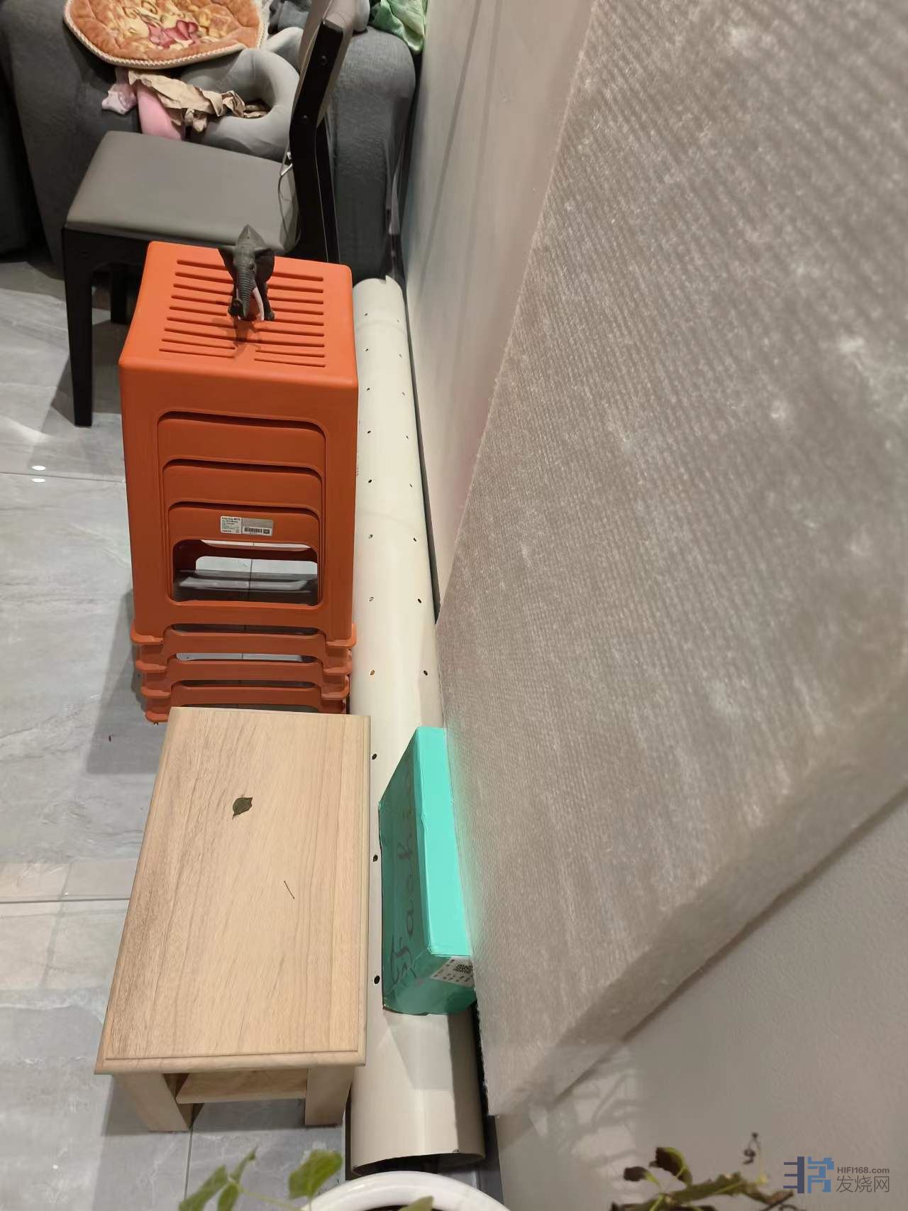 5、竖直放置的排水管,下部开槽,除了留出三个或者四个脚站稳之外,其余全部开槽,高度30~60mm,里面放一个厨房洗菜沥水用的多孔塑料篮子,把吸音棉抬高,离地顶起来,至少不低于开槽的高度,不让吸音棉在正立面露出来,可显著提高吸收低频的效率。我的体会是仅此一点提升音质的幅度不低于升级贵价线材。
