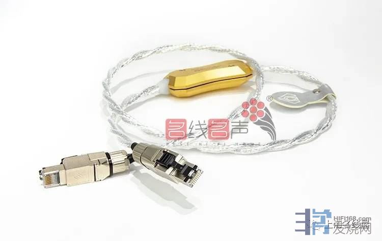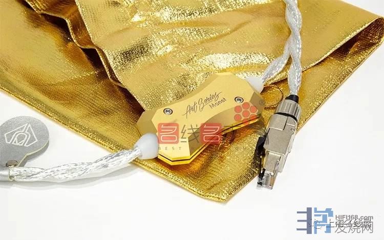 再来过去CrystalConnect线身上都有一个金属的椭圆形装饰环,上面打印着线材编号来验明正身,而Art Series系列线材的装饰环换成金色,形状也更有设计感,且这次不只是装饰,据原厂表示它还具有电气隔离的效果,估计对音质也能呈现正面的影响。最后,像莫奈这个高档的网线,当然也用上了德国大厂Telegärtner的RJ45端子,内部具备双重屏蔽,能有效过滤网路端口的数位杂讯,传支援最高100Mbps的传输频宽,对应目前主流的高解析串流音乐,能够完整捕捉微小的音乐细节。