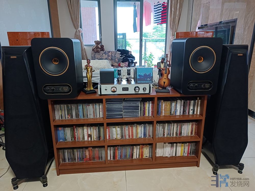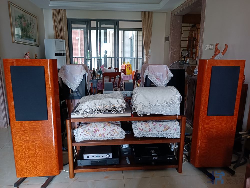 我家的音响摆法不是正确发烧的摆法,缺少了很多低音。例如文杰的随想曲峰哥设计是靠墙摆的,我怕音箱脚绊倒家人,自己又贪心买了几对箱,房子小,而占有欲强,就拿音响将客厅分割成两边,饭厅和客厅都可听音响。当然效果无法发挥音箱的八成功力,不过调整一下听音位置,形成等边三角型的位置听效果还是可以接受的,如以后加超低音箱就更完美了。那对天朗有源箱就临时摆摆,等买到合适的脚架再考虑放其他地方。